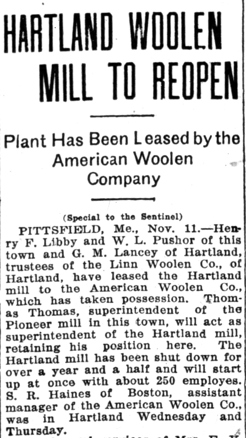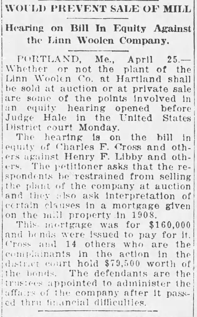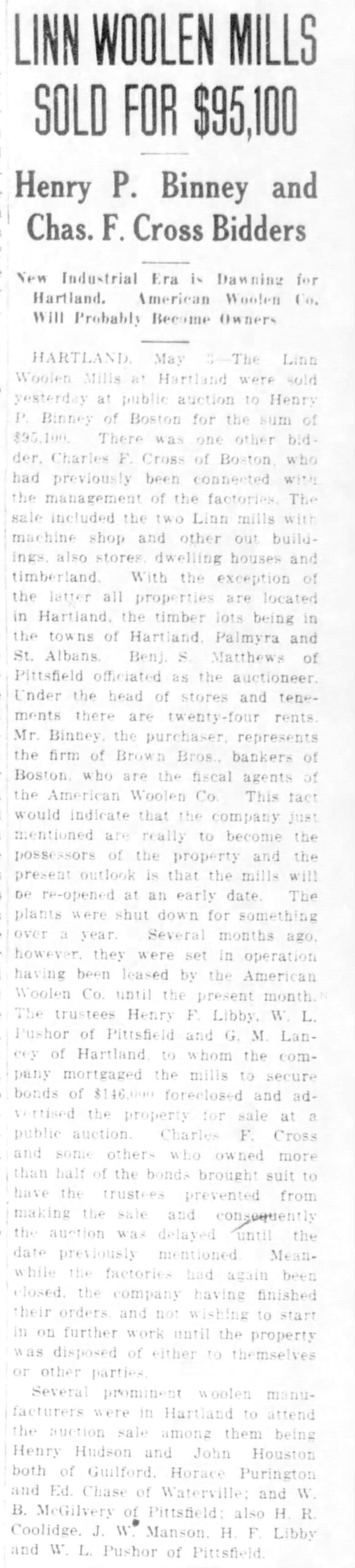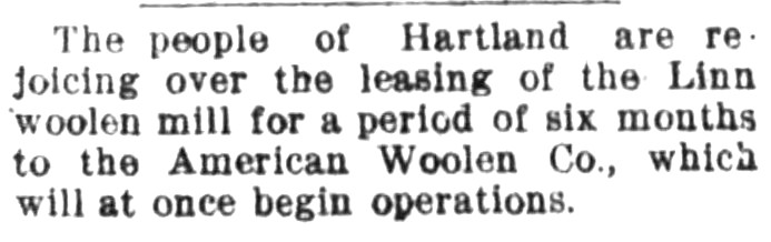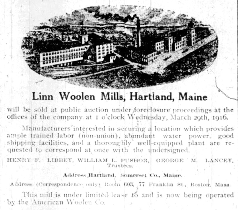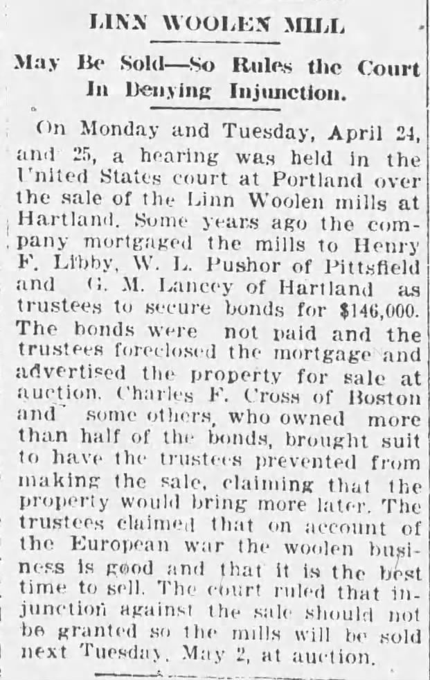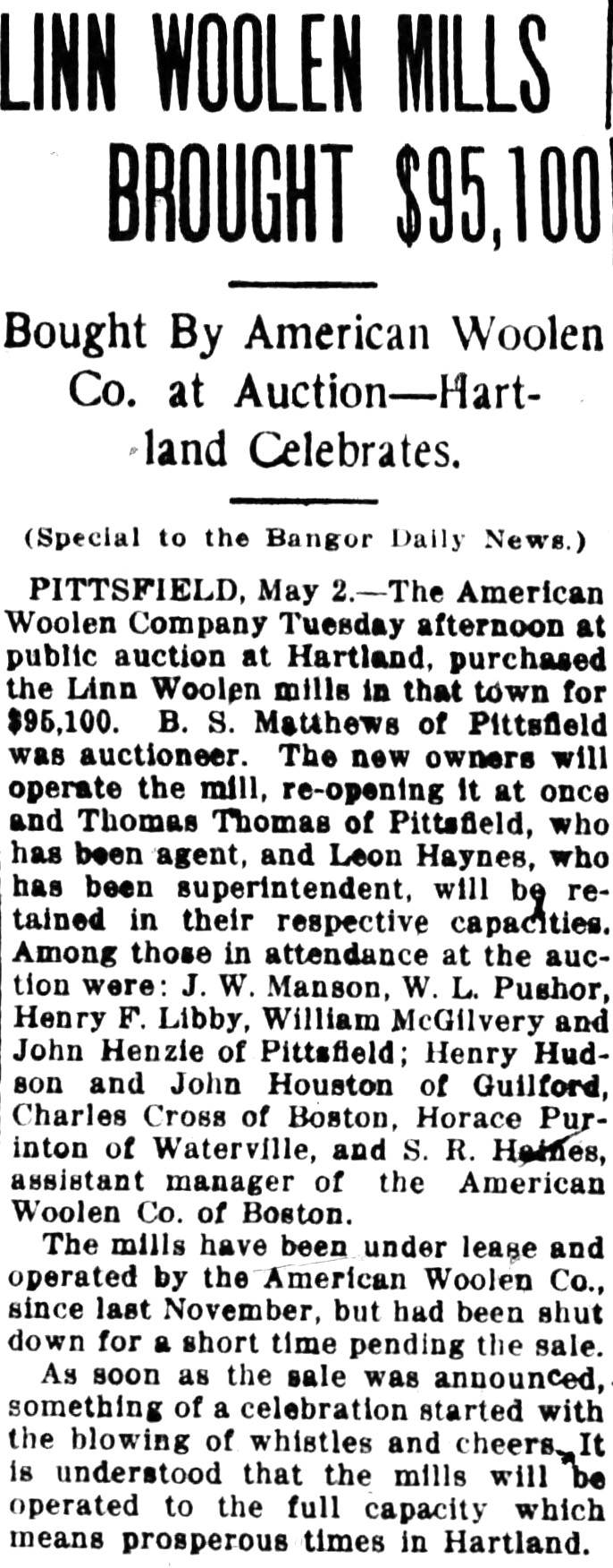 On May 2, 1916 the Linn Woolen Mills were sold by the Trustees of the Linn Woolen Company Mortgage Bond at public auction in Hartland to Henry P. Binney of Boston on behalf of the American Woolen Company.