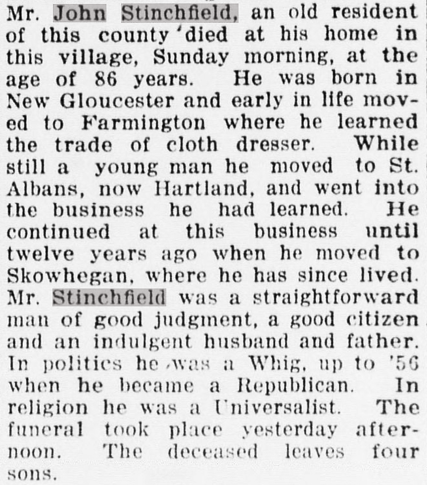 John Stinchfield, Sr & Maria moved to Skowhegan in early 1868 joining their sons Benjamin and Calvin Stinchfield who lived next door to each other. Maria passed away soon after they moved and John was living with Calvin in Skowhegan in 1870 noted at 77 years old. His obituary noted several details of his life including his time in Hartland noted as “then St Albans” and his profession as a clothier. He and Maria are interred together at Southside Cemetery in Skowhegan with Benjamin and Calvin.