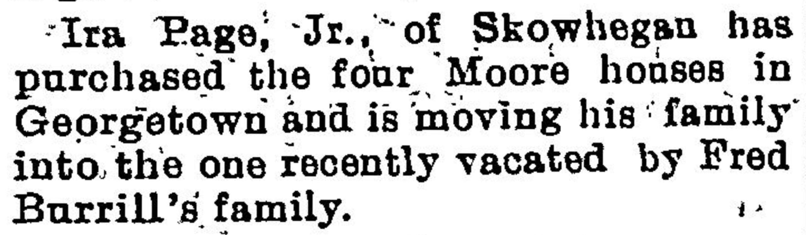 Newspaper article referencing the 1909 purchase of the “Moore Houses” by Walter’s nephew Ira Page, Jr.