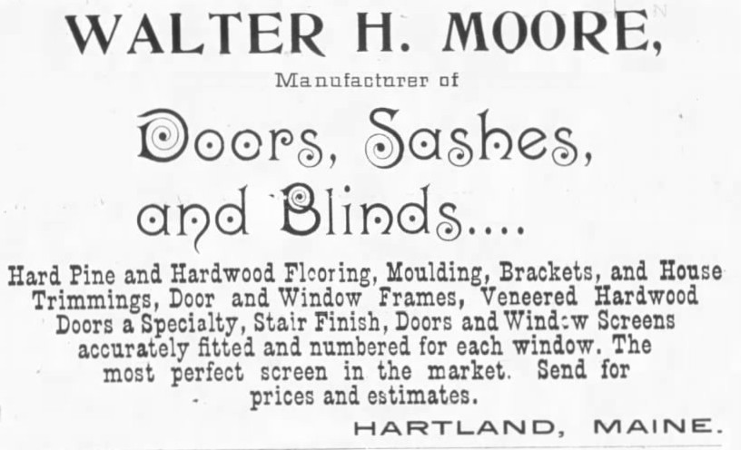 Records indicate Walter continued woodworking operations at the Upper Dam up until the untimely death of his 1st wife Florence Belle (Page) Moore on December 22, 1909 at 44yrs old. In early 1910, Walter’s father-in-law Ira W. Page, Sr and his son Ira W. Page, Jr moved their sash & blind manufacturing business from Skowhegan into the former W. H. Moore Woodworking Mill. Before they moved to Skowhegan, Ira Page, Sr and his wife Maria Folsom, had lived in Hartland for some 25 years where she operated a millinery shop on Commercial Street for many years. The new business venture was short lived as Ira left town soon after Maria’s death in 1912.