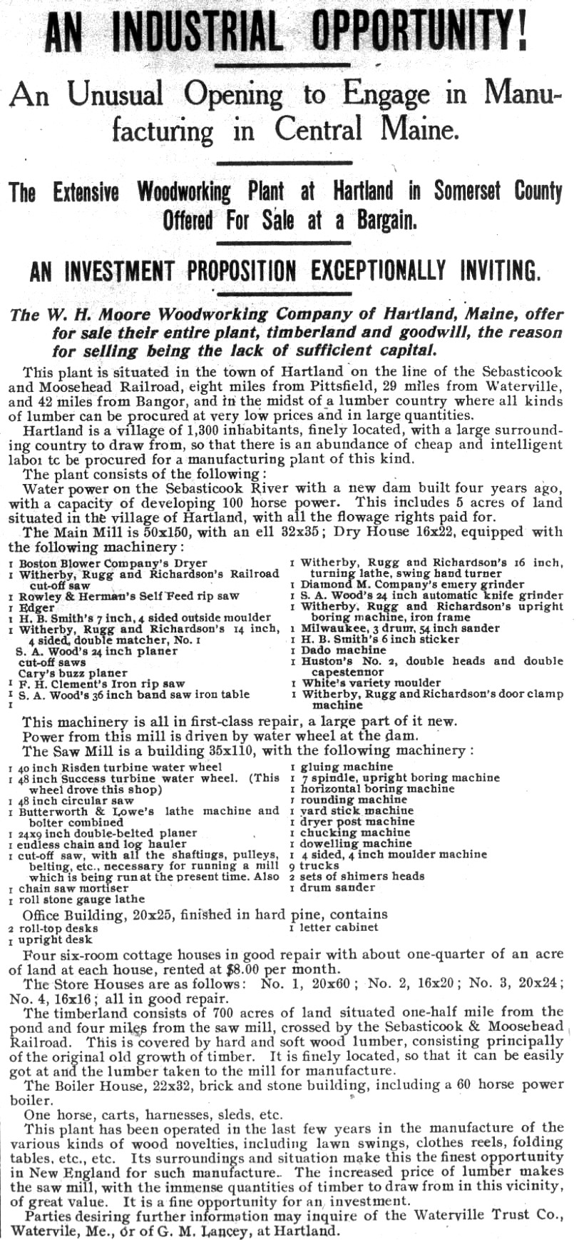 Following the closure of the Smith & Bowman wood novelty business, Walter resumed temporary operations at the woodworking mill as the Walter H. Moore Woodworking Company however he soon put the entire woodworking business, sawmill, properties and timberland up for sale in 1906 citing a lack of sufficient capitol. Although a sale was not made, the ad provides some incredible details to the machinery and operations at the time.