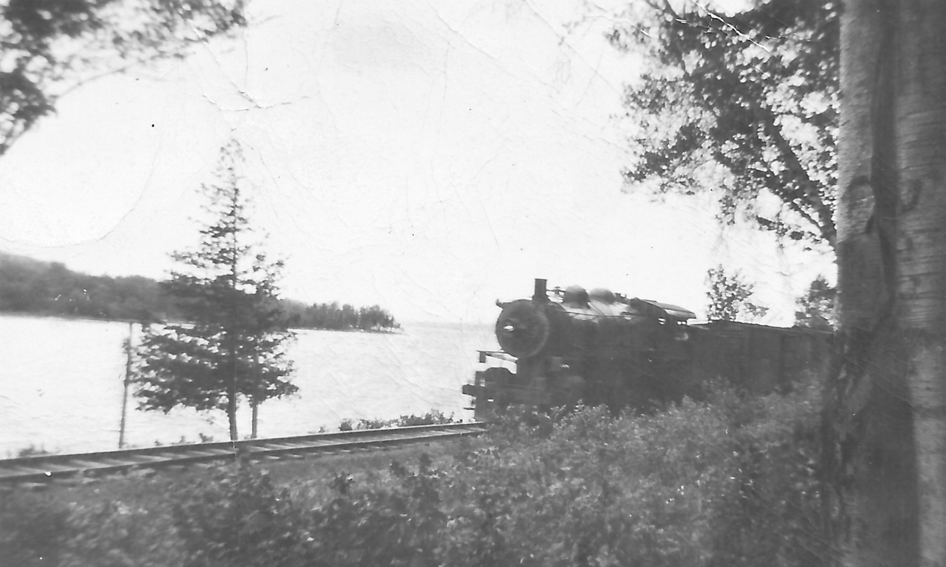 A Maine Central Railroad Locomotive rolls along Great Moose Lake on its way to the Hartland Depot