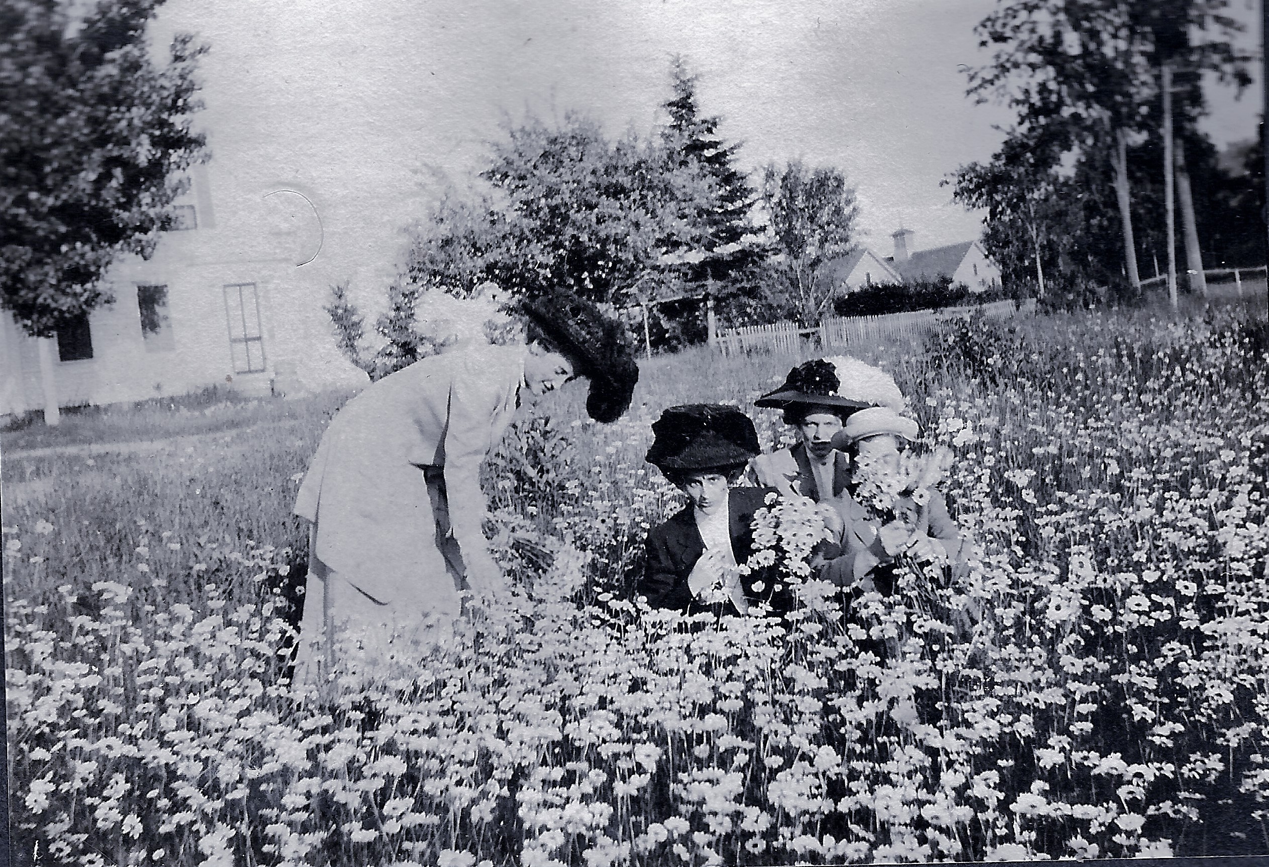 Mary (Anderson) Butterfield & friends picking daisies behind Pleasant Street – c1905