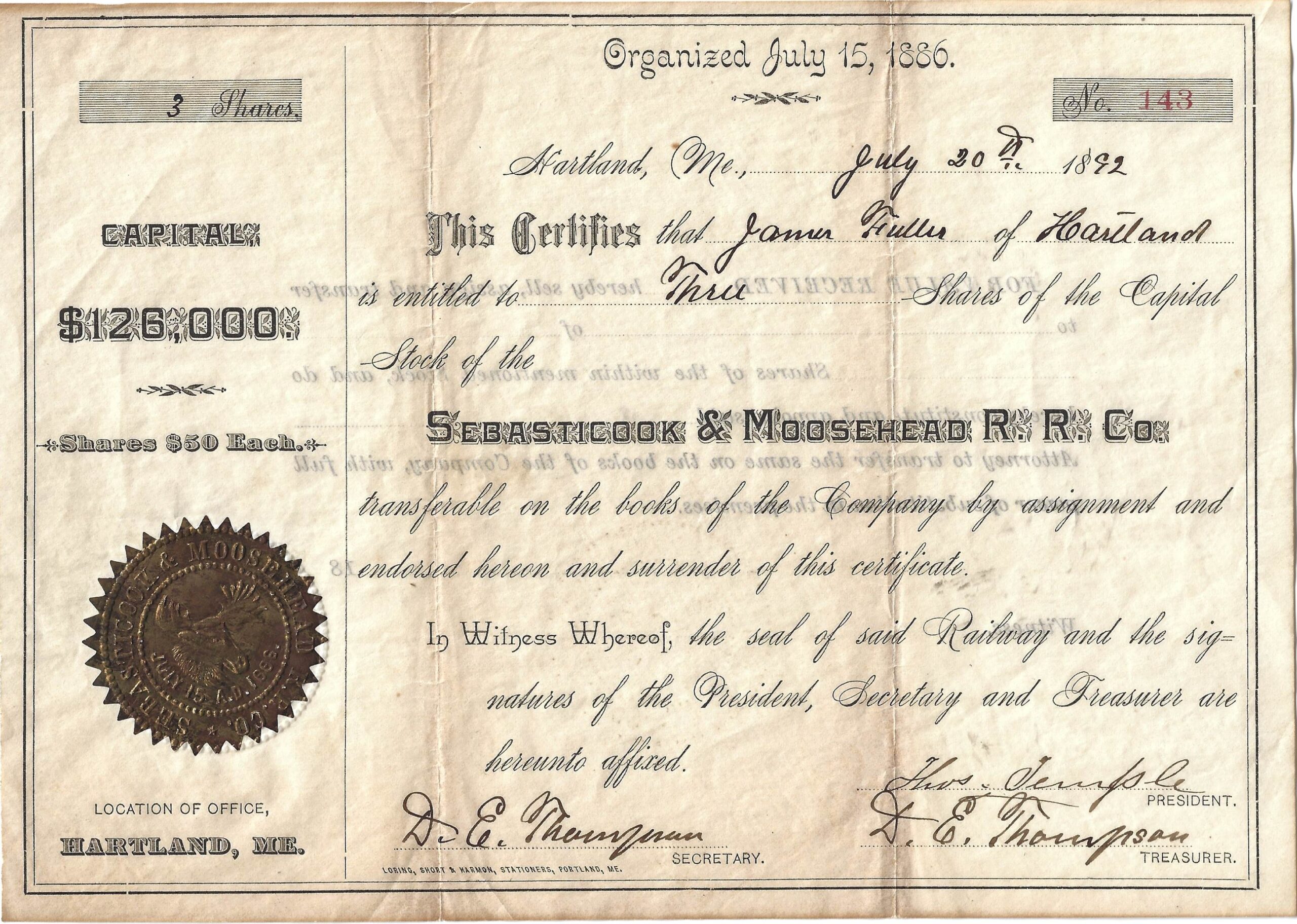 On Saturday, July 17, 1886 stockholders of the new Sebasticook & Moosehead Lake Railroad Company met and voted in the following Board of Directors: Thomas Temple of Fredericton, New Brunswick; James Mitchell of Melrose, Massachusetts; Wesley Vanwart of Fredericton, New Brunswick; James O. Bradbury & Greenville J. Shaw of Hartland.
